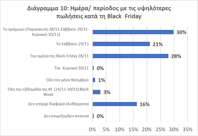 - Παρατηρείται συσχέτιση επισκεψιμότητας – πωλήσεων αφού για το 30% των επιχειρήσεων οι πωλήσεις κορυφώθηκαν το τριήμερο “Black Friday”, Σάββατο και Κυριακή και για το 28% η Παρασκευή 28/11 (Διάγραμμα 10).