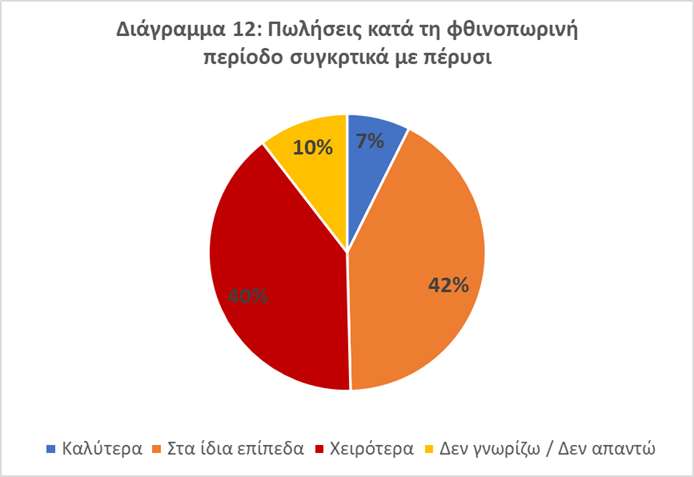 - Για 8 στις 10 επιχειρήσεις οι πωλήσεις ολόκληρου του φθινοπώρου ανήλθαν στα ίδια ή σε χαμηλότερα επίπεδα συγκριτικά με την αντίστοιχη περίοδο του 2024 (Διάγραμμα 12).