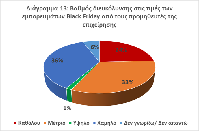 - Έξι στις 10 επιχειρήσεις δήλωσαν πως οι προμηθευτές τους δεν τους διευκόλυναν στις τιμές των εμπορευμάτων “Black Friday” (Διάγραμμα 13).