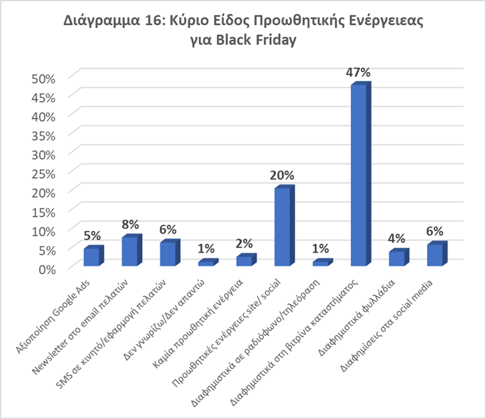- Κυρίαρχη θέση τις προωθητικές ενέργειες για την “Black Friday” έχουν τα διαφημιστικά μηνύματα στη βιτρίνα του καταστήματος για τις μισές επιχειρήσεις (47%) ενώ δυναμικά κινούνται και οι ενέργειες στα social media (Διάγραμμα 16).