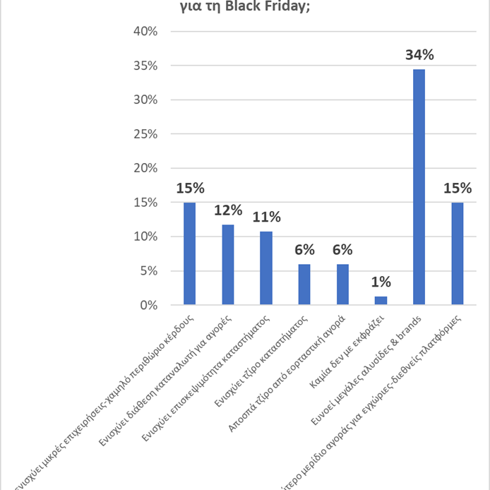 - Την αξία της πρακτικής της “Black Friday” αμφισβητεί το 64% των επιχειρήσεων σωρευτικά, θεωρώντας ότι ευνοεί τις μεγάλες αλυσίδες-brands, προσφέρει μεγαλύτερο μερίδιο αγοράς σε εγχώριες και διεθνείς πλατφόρμες, ενώ δεν ευνοεί τις μικρές λόγω χαμηλού περιθωρίου κέρδους (Διάγραμμα 15).