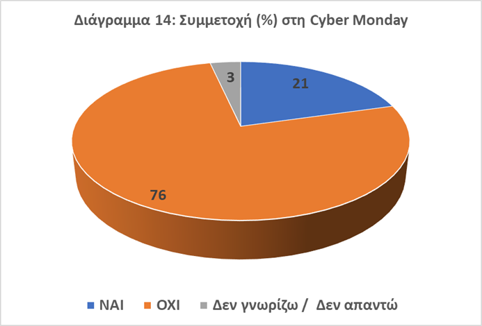 - Μόνο 1 στις 5 επιχειρήσεις συμμετείχε στη “Cyber Monday” (Διάγραμμα 14).
