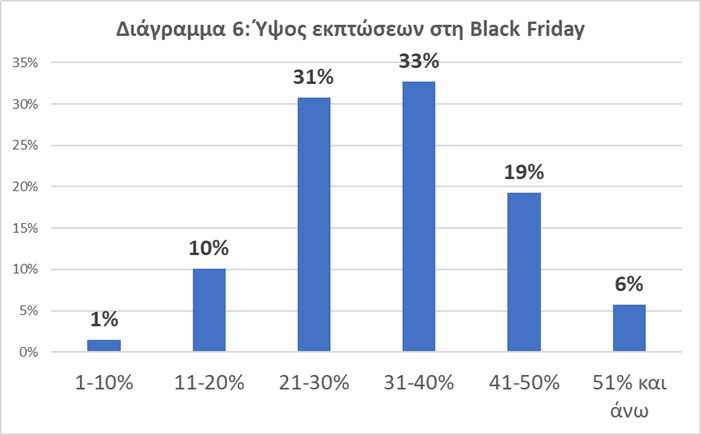 - Μία στις τρεις επιχειρήσεις επέλεξε εκπτώσεις ύψους από 31% έως 40%, ενώ το 31% των επιχειρήσεων προτίμησε το εκπτωτικό κλιμάκιο από 21% έως 30% (Διάγραμμα 6).