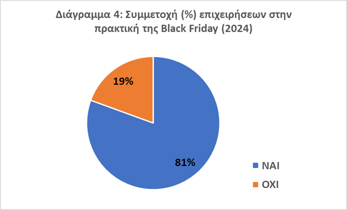 - Στη φετινή περίοδο της “Black Friday” συμμετείχε υψηλό ποσοστό επιχειρήσεων (81%), ίδιο με εκείνο του 2024 (Διάγραμμα 4).