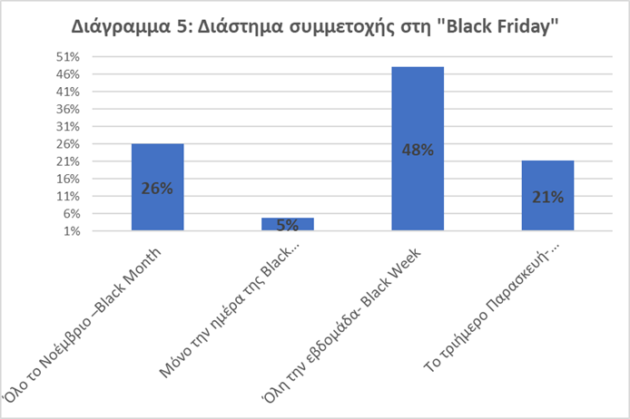 - Αναφορικά με το διάστημα συμμετοχής, το 48% των επιχειρήσεων συμμετείχε όλη την εβδομάδα της “Black Friday” ενώ μία στις τέσσερις επιχειρήσεις (26%) δεν δίστασε να υιοθετήσει προσφορές όλο το Νοέμβριο (Διάγραμμα 5).