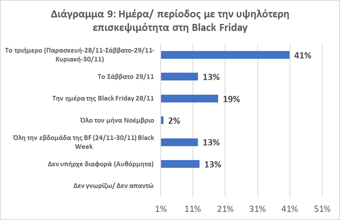 - Για 4 στις 10 επιχειρήσεις η επισκεψιμότητα κορυφώθηκε το τριήμερο “Black Friday” (Παρασκευή, Σάββατο και Κυριακή) ενώ για 1 στις 5 την ημέρα της “Black Friday” (Διάγραμμα 9).
