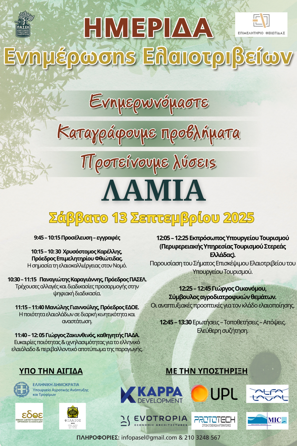 Το Επιμελητήριο Φθιώτιδας, σε συνεργασία με τον Πανελλήνιο Σύνδεσμο Ελαιουργείων (ΠΑΣΕΛ), διοργανώνει Ημερίδα Ενημέρωσης Ελαιοτριβέων και Ελαιοπαραγωγών, το Σάββατο 13 Σεπτεμβρίου 2025, στο Αμφιθέατρο της ΔΕΥΑ Λαμίας (Τ. Ισαάκ & Α. Παπανδρέου).