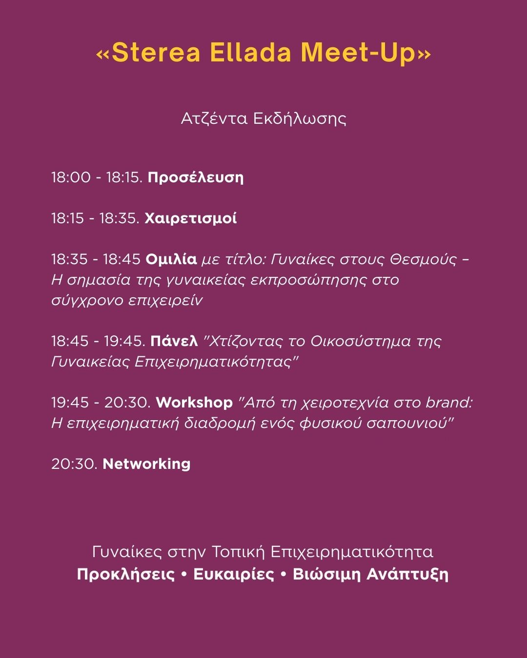 Η εκδήλωση θα ολοκληρωθεί με networking, δίνοντας τη δυνατότητα στους συμμετέχοντες να ανταλλάξουν εμπειρίες, να αναπτύξουν συνεργασίες και να ενισχύσουν το δίκτυο της γυναικείας επιχειρηματικότητας στη Στερεά Ελλάδα.